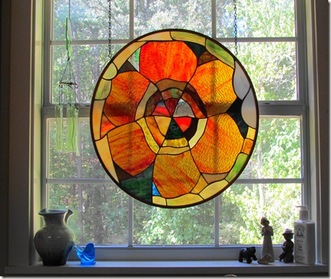 And, Fred hung our new stained glass pieces that we bought on our travels……This one over the kitchen window is from Quebec.