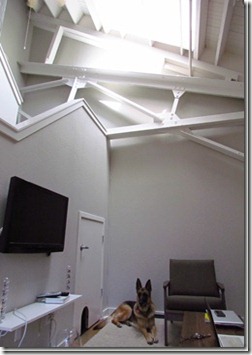 This is Laura and Dave’s living room…..and a ‘tall’ view to show the metal beams from the original structure. New paint and a new sofa, rug and coffee table help pull this room together. And Laura built the end table, too.