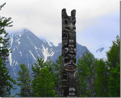 The tour of these longhouses highlighted the ceremonial uses of the buildings as well as the daily life of the Gitxsan people. Their long winter months were spent in these longhouses and the time was passed weaving, carving, painting and creating objects of art as well as ornamenting the every day items. And, of course, everyone enjoyed singing, dancing, and the telling of their stories.These longhouses were filled with wonderful examples of the native talent. Unfortunately, no photos were allowed.