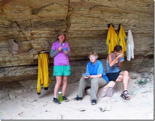 Every evening when we set up our sleeping area, we changed into dry clothes and shoes and laid our wet things out to dry on a rock, or tree limb or bush…whatever was handy. In the desert air, our things would usually be dry in a couple of hours.